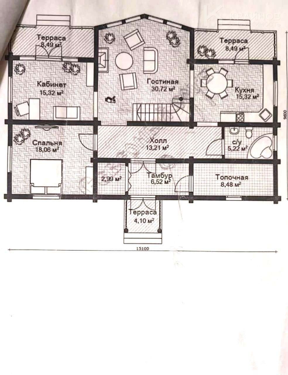 Сруб изготовлен из зимнего леса, сухой устоявшийся дом. Две террасы по 8, 49 м и одна 4, 10 м. Две гардеробные 2, 99м и 3, 06м.