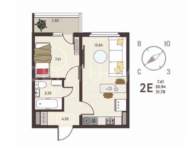 кухня - гостиная 15.84 кв. м. спальня 7.61 кв. м.
